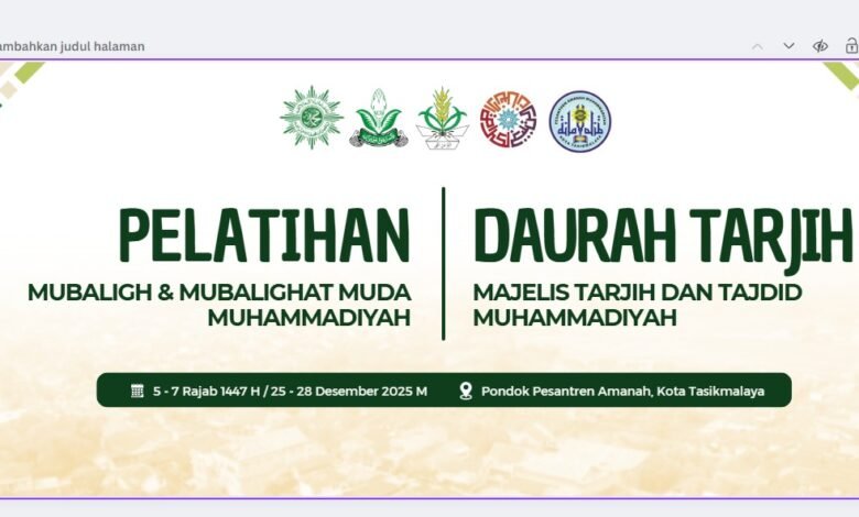 Sementara itu, Pelatihan Muballigh/Muballighah Muda Muhammadiyah Jawa Barat akan berlangsung pada 25–28 Desember 2025 dengan mengusung tema “Muballigh Muda Bangun Kota dan Desa untuk Kemajuan Bersama.” Pelatihan ini dirancang untuk menyiapkan kader dakwah muda Muhammadiyah agar mampu berperan aktif sebagai ujung tombak dakwah yang inklusif, responsif, dan menyentuh masyarakat hingga tingkat desa.